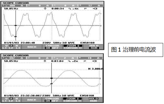 陜西某著名風景區(qū)附近的星級酒店, 在未使用有源濾波器時,總進線開關無故跳閘,嚴重影響到酒店的經(jīng)濟效益。經(jīng)分析,該項目配電系統(tǒng)負載主要為節(jié)能燈、空調(diào)、水泵等設備,并存在三相不平衡的情況。同時,電網(wǎng)中存在大量的諧波電流污染,主要以 3,5,7次為主,N 相電流極大,諧波含量大,三相不平衡嚴重(負序電流大) ,導致該變壓器下其他設備不能正常工作,同時,變壓器發(fā)熱量大。之后采用有源濾波器集中補償諧波電流,共 6臺變壓器,每臺變壓器采用 150 A 有源濾波器。使用我司生產(chǎn)研制的型號ZD-AMS有源濾波器后,電流波形矯正明顯由極不平衡的狀態(tài)治理成了極為平滑的正弦波, 諧波電流有效值在超出濾波器容量范圍的情況下, 有源濾波器的補償率達到了90%以上,三相不平衡現(xiàn)象有所改善,有效解決了總進線開關無故跳閘的問題,具體情況如圖 1所示。