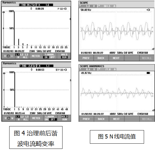 系統(tǒng)總電流由 408 A 降低為 397 A,電流有效值降低了3%;總的電流畸變率由 20.7%降為 2.8%,N 線電流下降明顯。治理前后諧波電流畸變率如圖 4所示。N 線電流值如圖 5所示