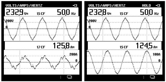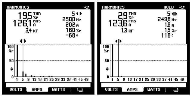 根據(jù)我司技術(shù)人員的測(cè)試分析后,決定安裝7臺(tái)有源電力濾波器分別用在兩個(gè)配電室:一號(hào)配電室兩臺(tái),二號(hào)配電室5臺(tái),每臺(tái)濾波器對(duì)應(yīng)一條“打葉線”,這樣的配置就可以達(dá)到有效抑制諧波,改善電網(wǎng)電能質(zhì)量的目的。治理效果如下圖所示: